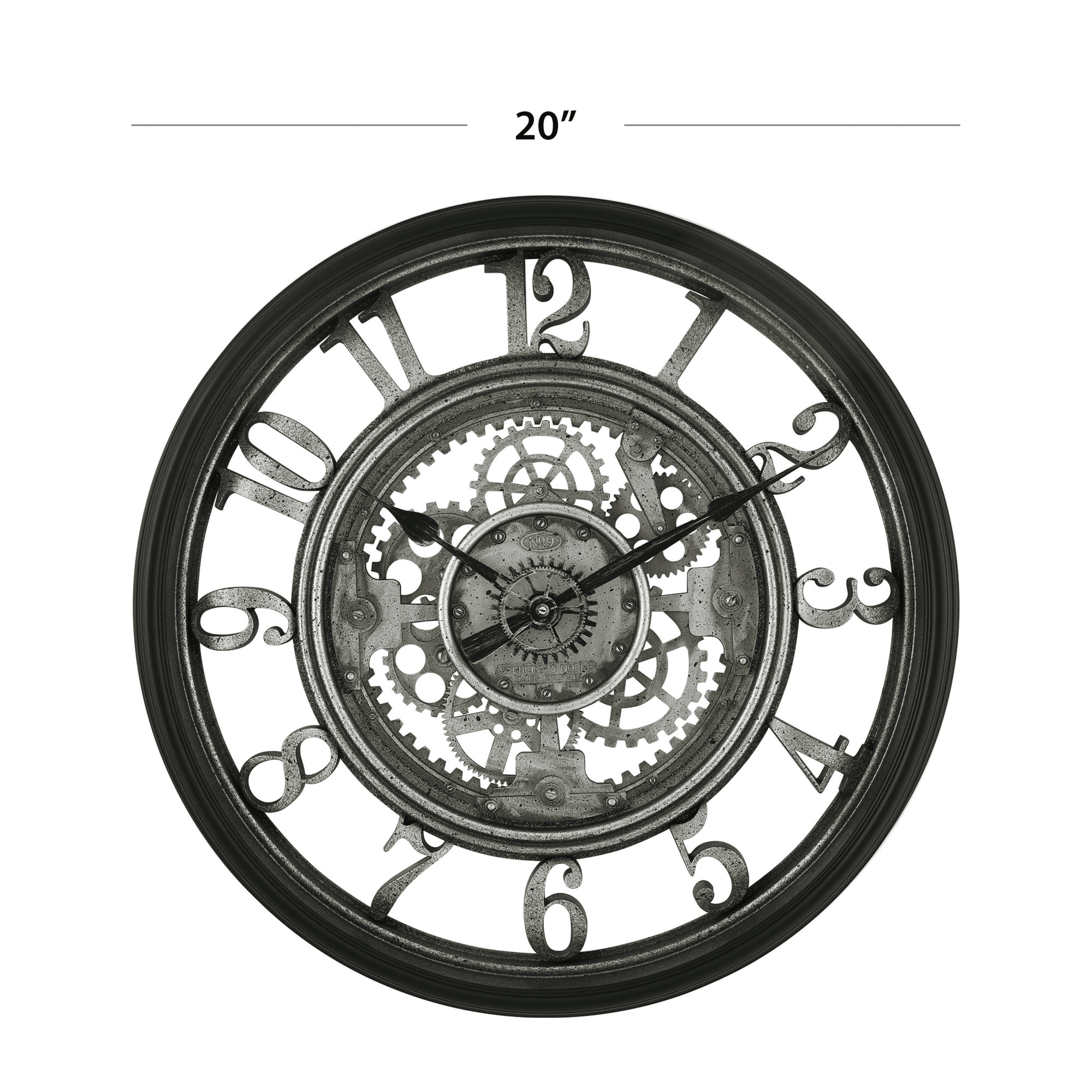 Compelling style and design merge with functionality in this better homes and gardens 20" gear clock, harkening back to the industrial age! This timepiece features radiating arabic numerals with exposed gears in the center, all hand coated in an aged metal finish. The satin black frame and satin black hands offset the clock' s design. The clock hands incorporate a gear shape that moves as the hands rotate. This moving gear element is captivating and enhances this clock' s overall aesthetic. Both the arabic numerals and gears are backless, allowing the surface which this piece is hung upon to show through; the floating illusion this creates adds even greater visual appeal. This clock is constructed of plastic, making it lightweight and easy to hang. A glass lens protects the clock' s center dial. Quality quartz movement ensures accurate timekeeping. Incorporate the industrial and steampunk style into your home' s space today with this magnificent piece!