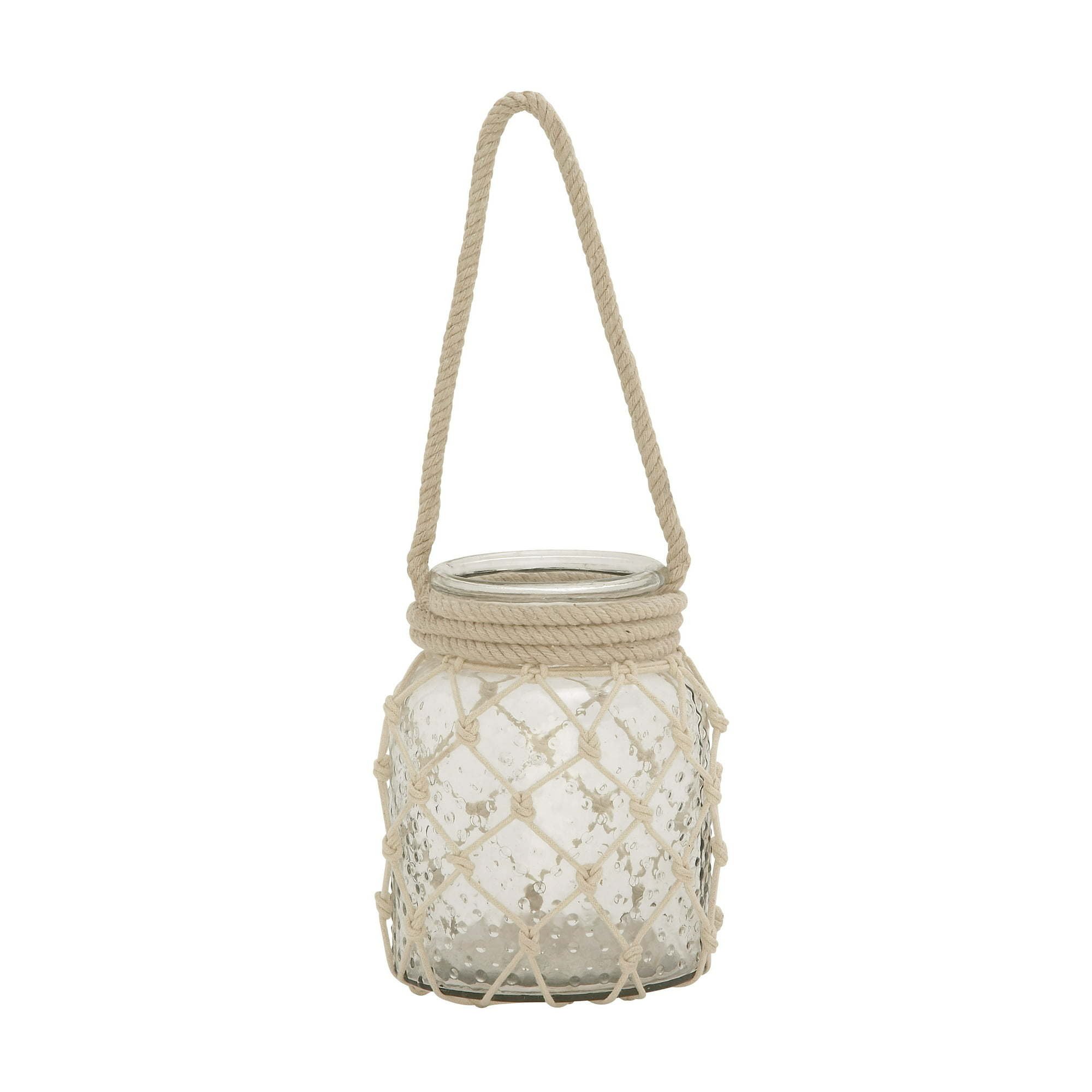 DecMode Clear Glass Decorative Candle Lantern with Rope Handle is a unique addition to your stylish home. Delight your guests and make any occasion extra special by adding a lighted or flameless candle to this lantern. Made with a sturdy base, it is perfect for creating an elegant atmosphere at your table top or mantel. Captured the beauty of the sea as you display this playful jar bottle pillar candle holder on light-toned wooden furniture pieces. Can hold one pillar candle, not included. This item ships in 1 carton. Please note that this item is for decorative use only. Glass candle lantern makes a great gift for any occasion. Suitable for indoor use only. This item ships fully assembled in one piece. Made in India. This is a single clear colored lantern candle holder. Coastal style.