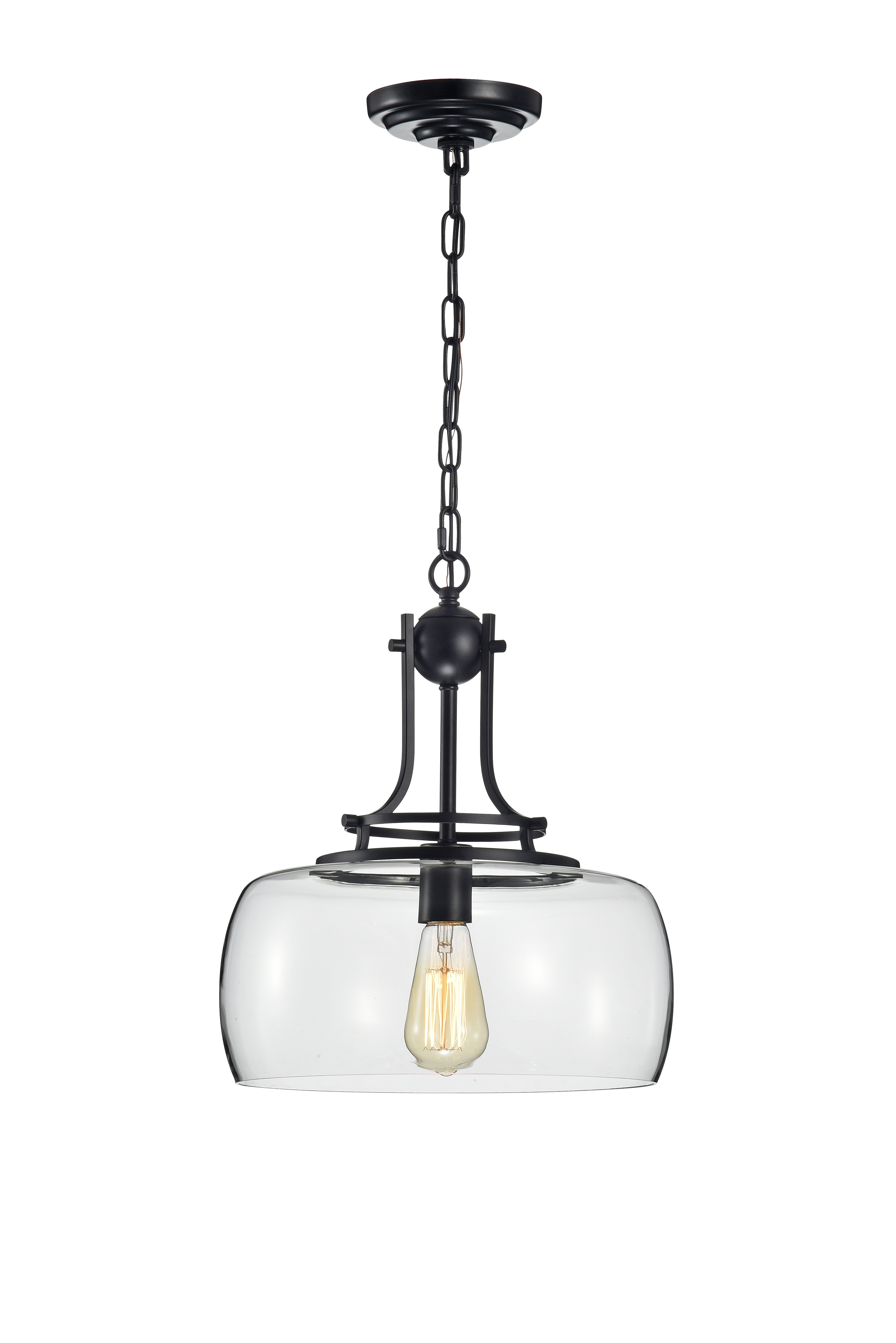 This single light pendant will add a subtle touch of modernity to your household. The clear glass shade is suspended from a matte black frame. The fixtures unique designslends itself to both industrial and modern home deor themes.