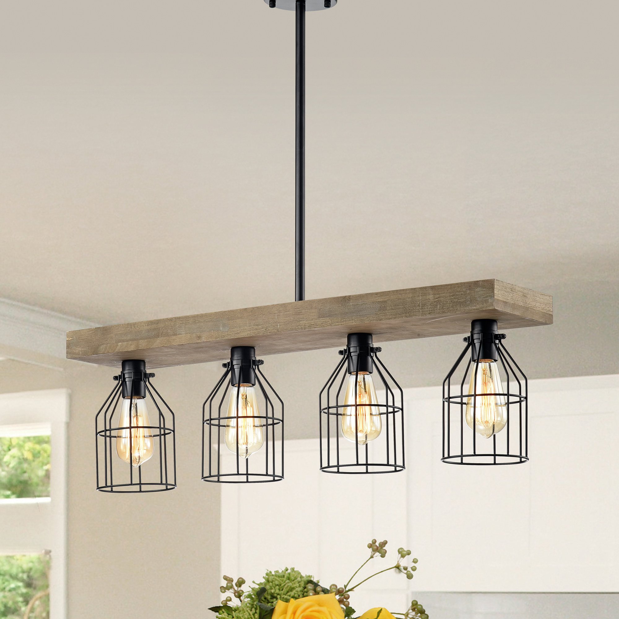Cater to contemporary farmhouse styling above your kitchen island with this Lourd chandelier. This four-light fixture boasts a rectangular wooden frame finished in weathered oak to create a stable foundation, and the lights appear in a row to create a wide area of light for proper illumination. Cage-style shades made of durable metal hang down from the wood base to create a stunning vintage design.
