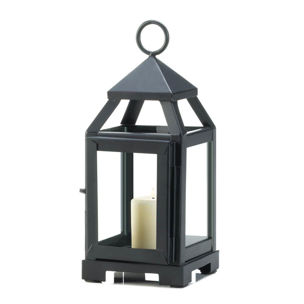 • This little lantern is the perfect lighting accent for even the smallest space. The sleek black framework is contemporary and cool, while the clear glass panels let the light from your favorite candle shine through. It's great indoors or outside!