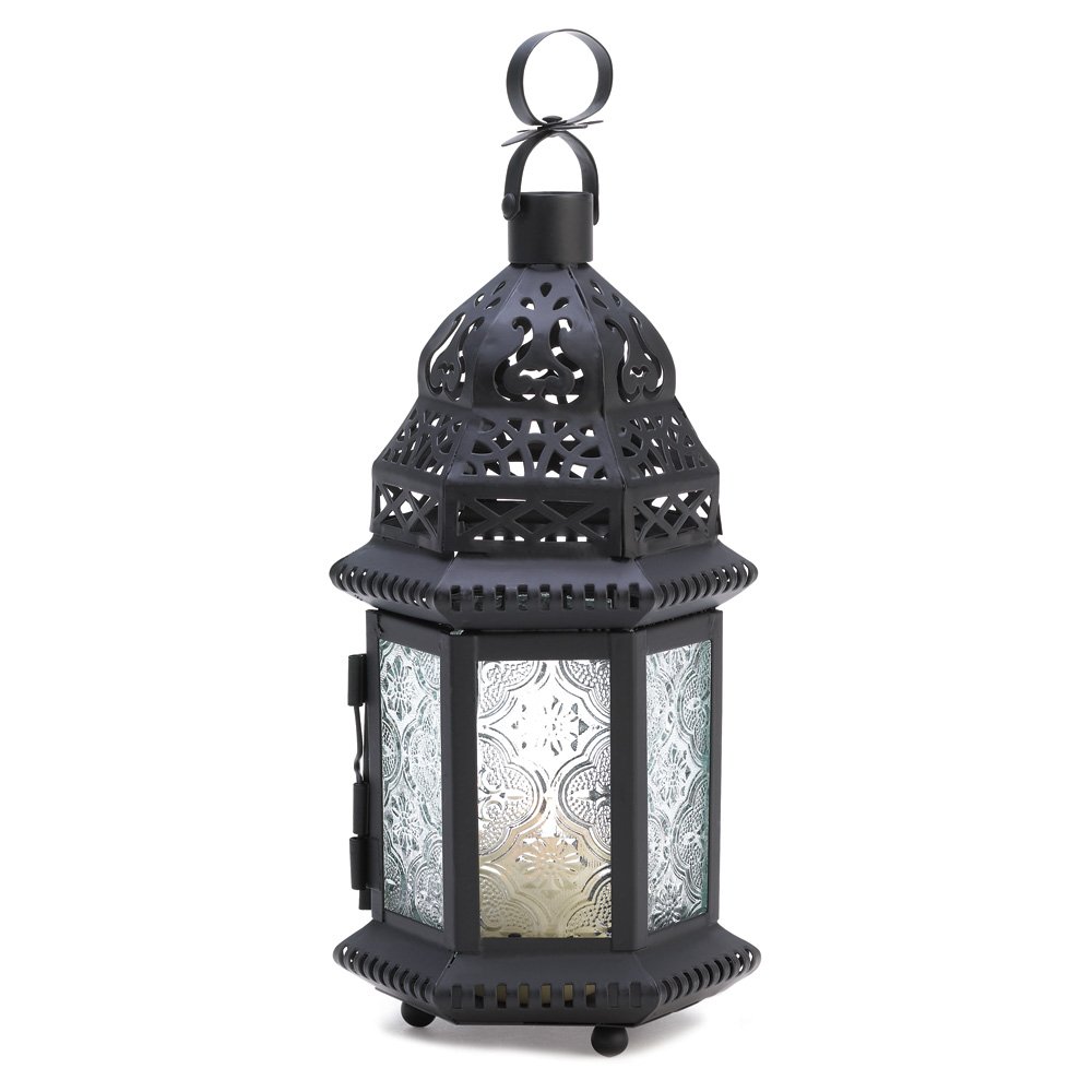 • Either hanging or stationary, this Moroccan style candle lantern casts gorgeous light on any table spread and provides a warm glow on brisk nights. Its decorative metal top and etched glass lend an exotic flair to any home.
