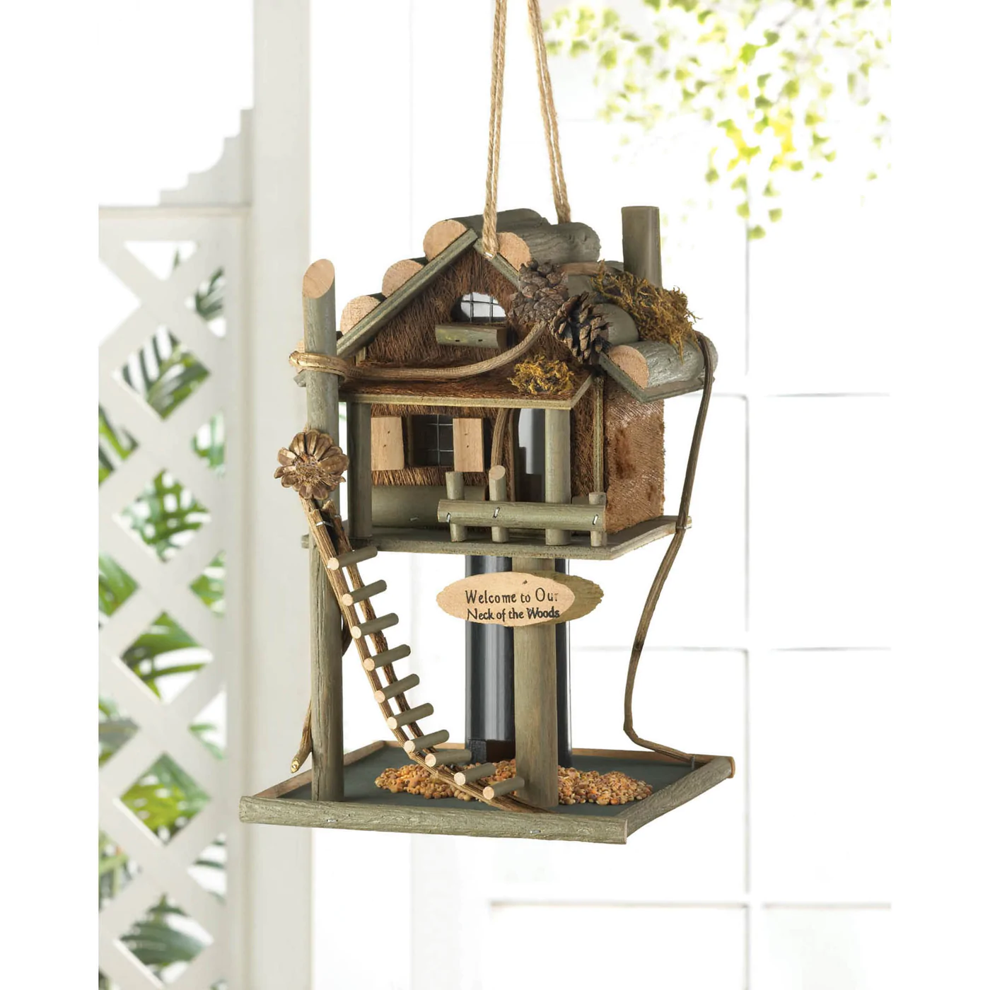 • Welcome birds to your 'neck of the woods' with this fantastic wooden way-station! Trimmed with twisty twigs, pinecones and a darling rough-hewn ladder, this bird feeder is the perfect stopping point for your feathered friend’s journey. Open up the roof to conveniently store bird seed inside the house. The seed falls down the center chute and pours out onto the tray base below where birds can perch and feed.