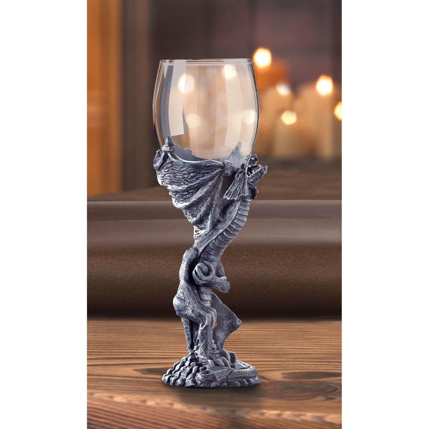 • An imposing roaring dragon forms a majestic base for a clear glass globe as this medieval-style goblet looks as impressive in your hand as it does at the banquet table! Decorative purposes only. Hand wash only.
