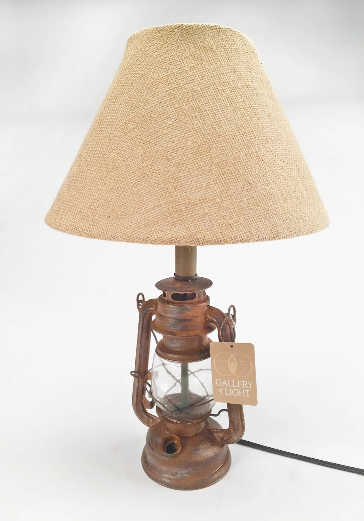 • Bring back some old world style to your living space with this fantastic iron lamp. It features an iron and glass vintage camping-style lantern base and has a burlap neutral shade that will work in any decor.