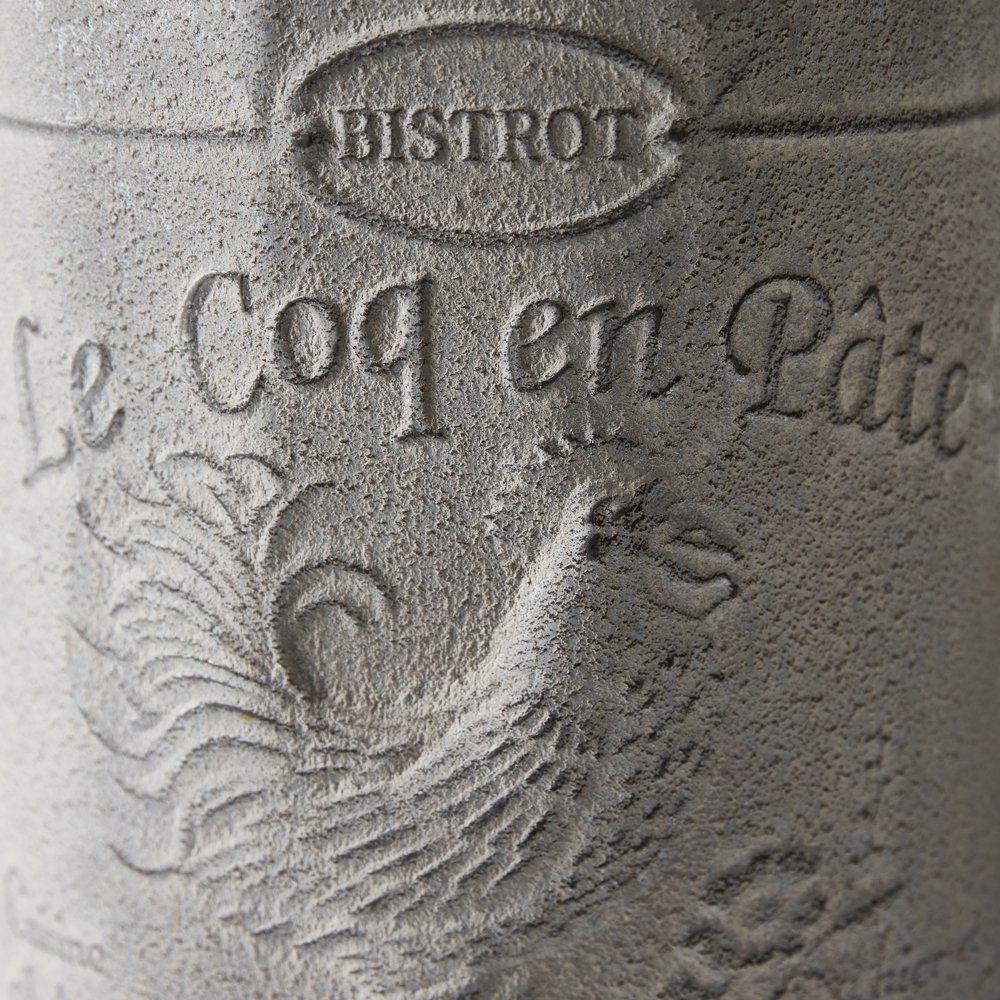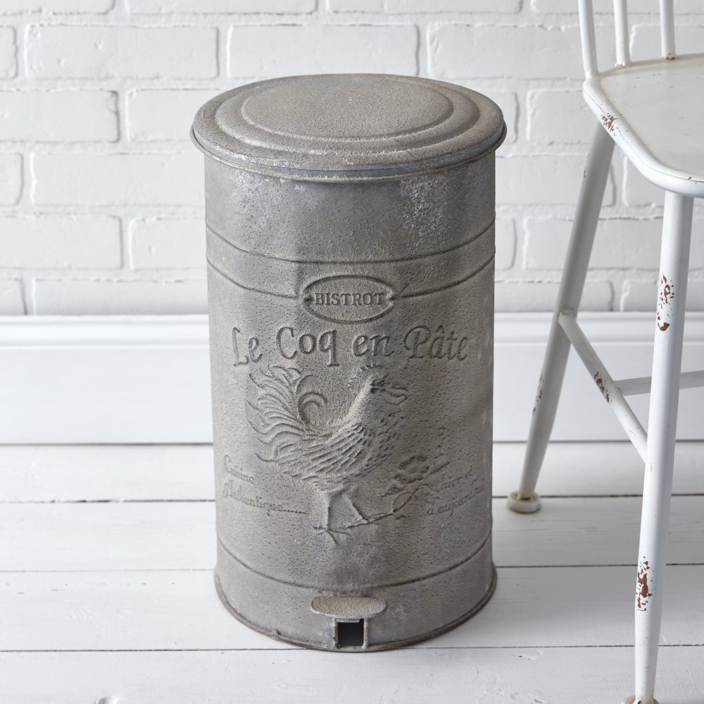 This trash can features a functional foot petal for opening. Reads ''Le Coq en Pâte.''