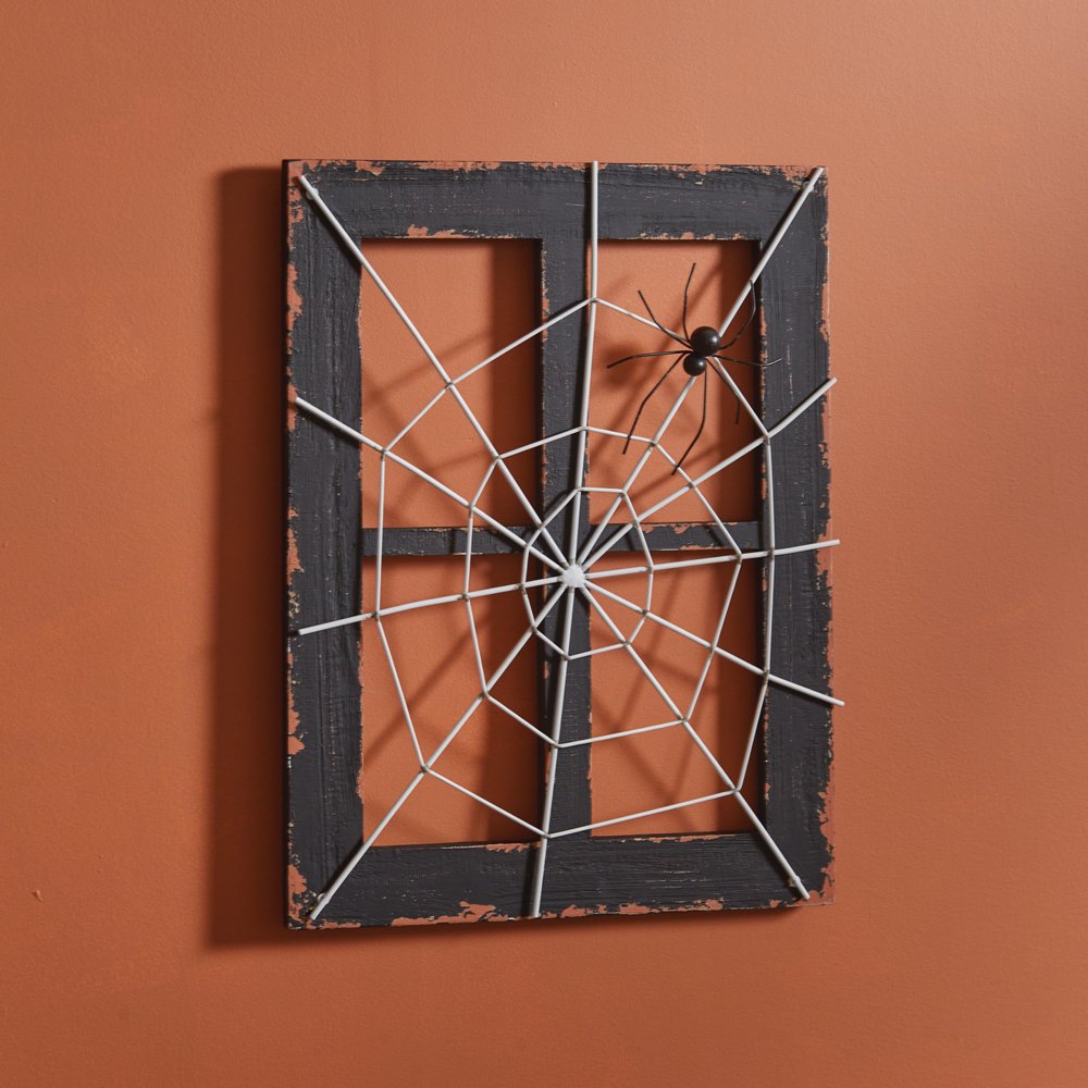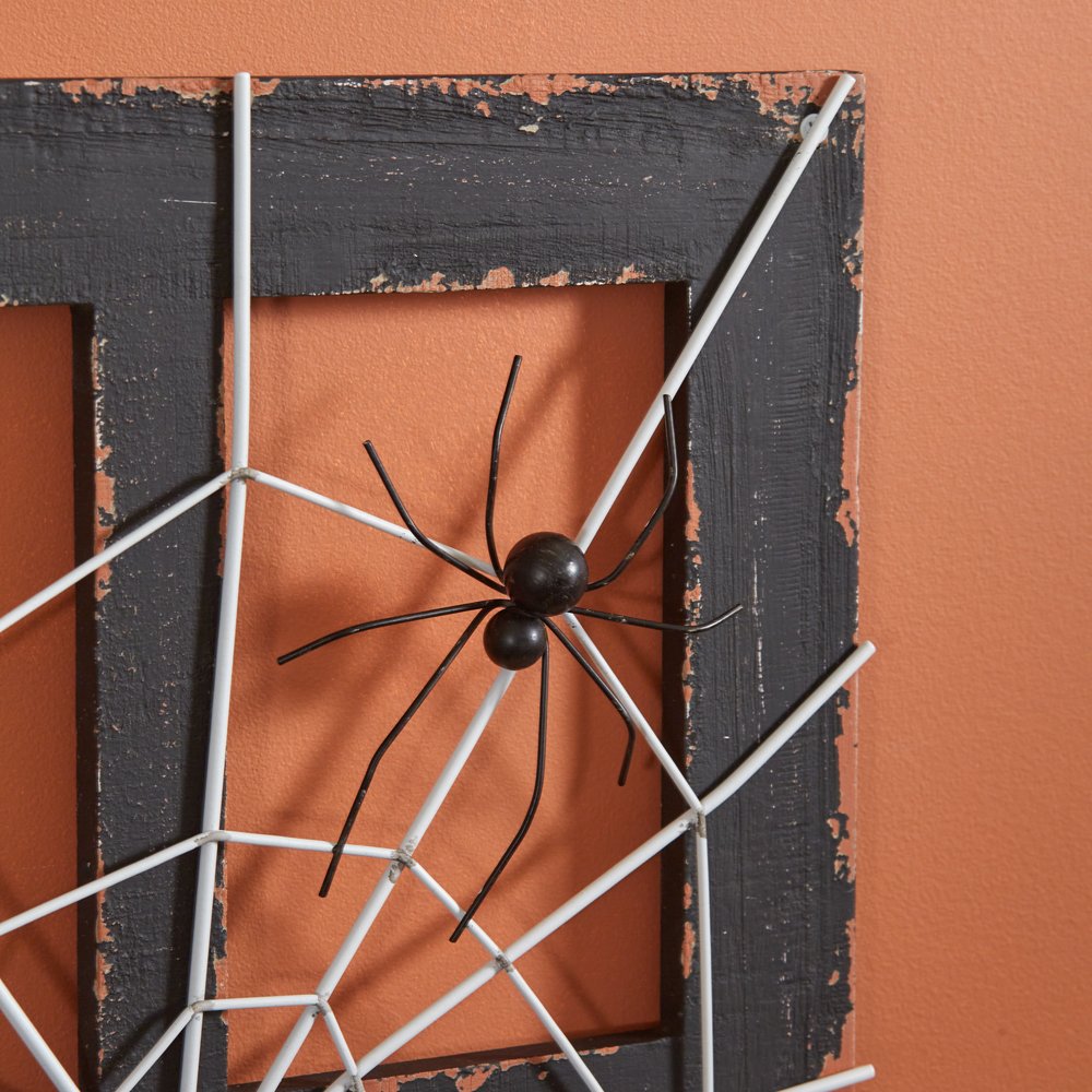 This creepy spider has spun a web in this rickety window and made it his home. It is a perfect decoration for your wall this Halloween! This item features a distressed, wooden frame and a metal spider and web. To hang, use its two triangle hangers.