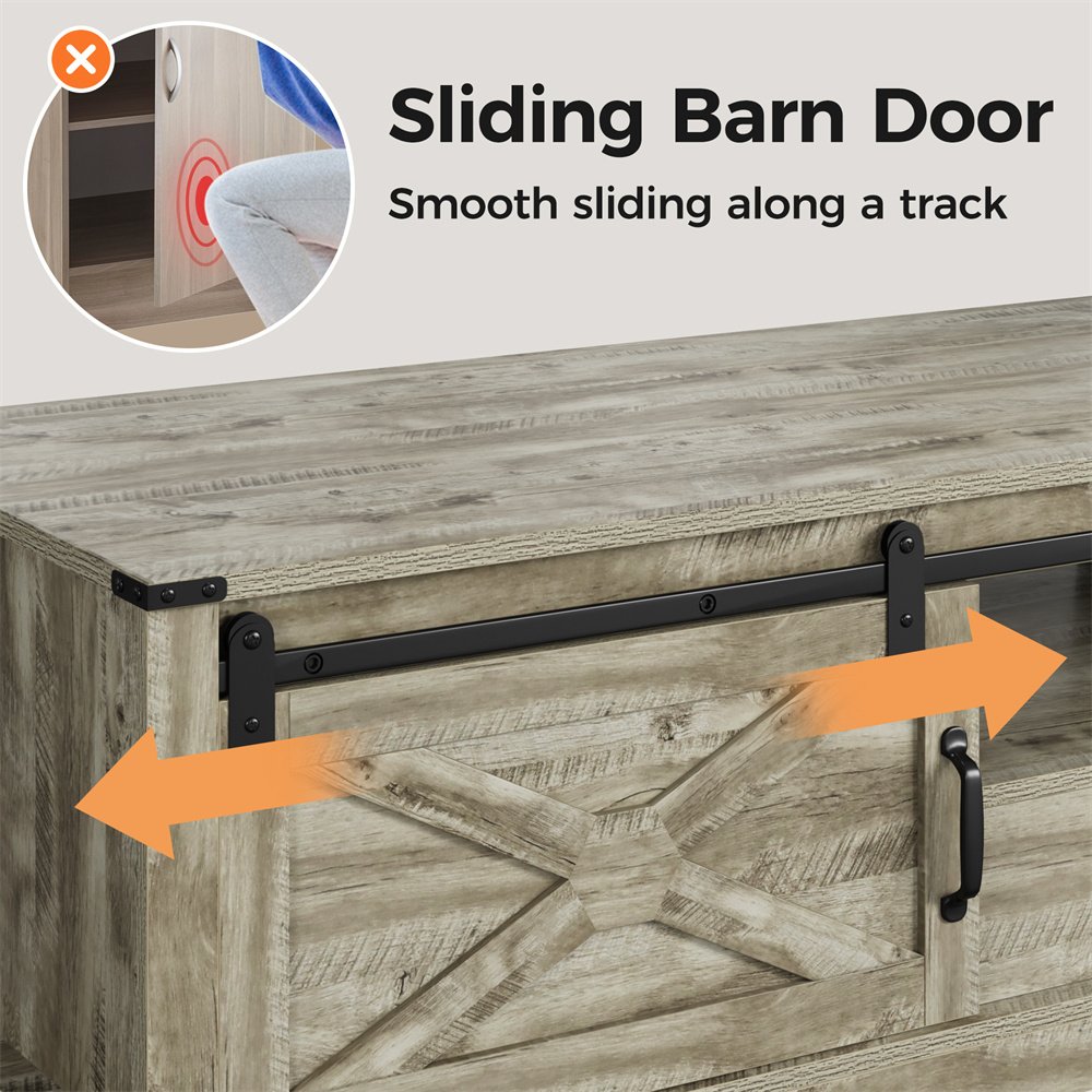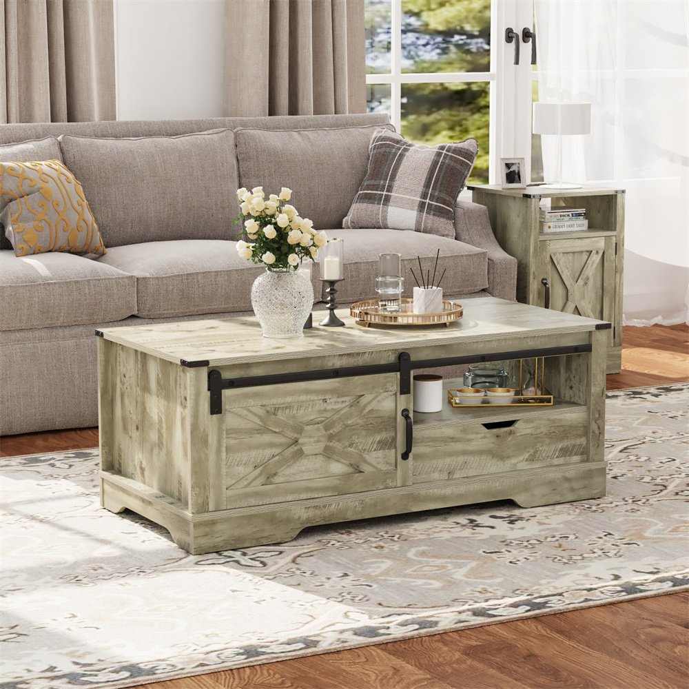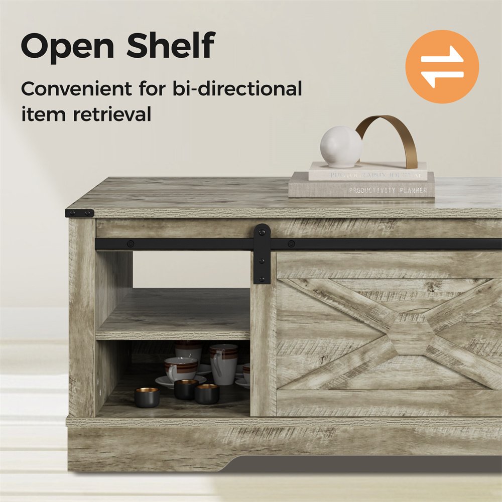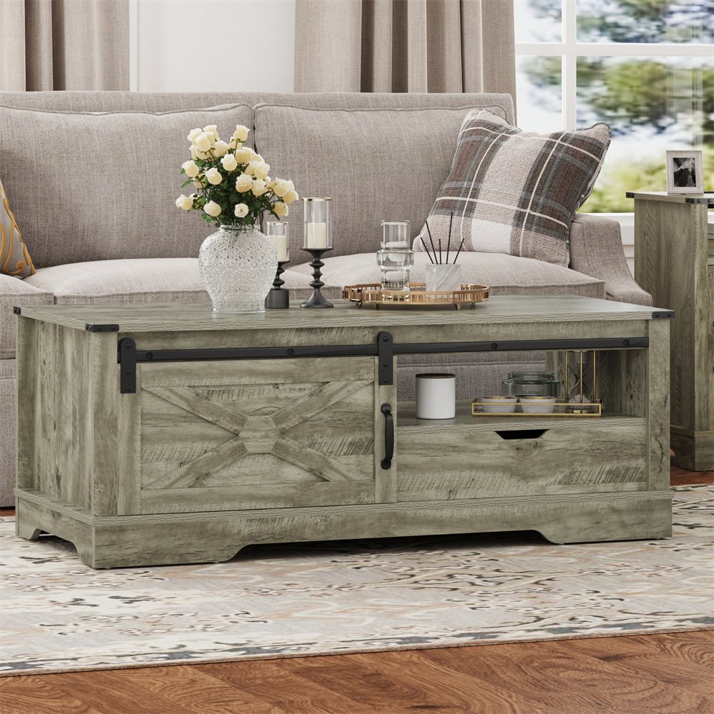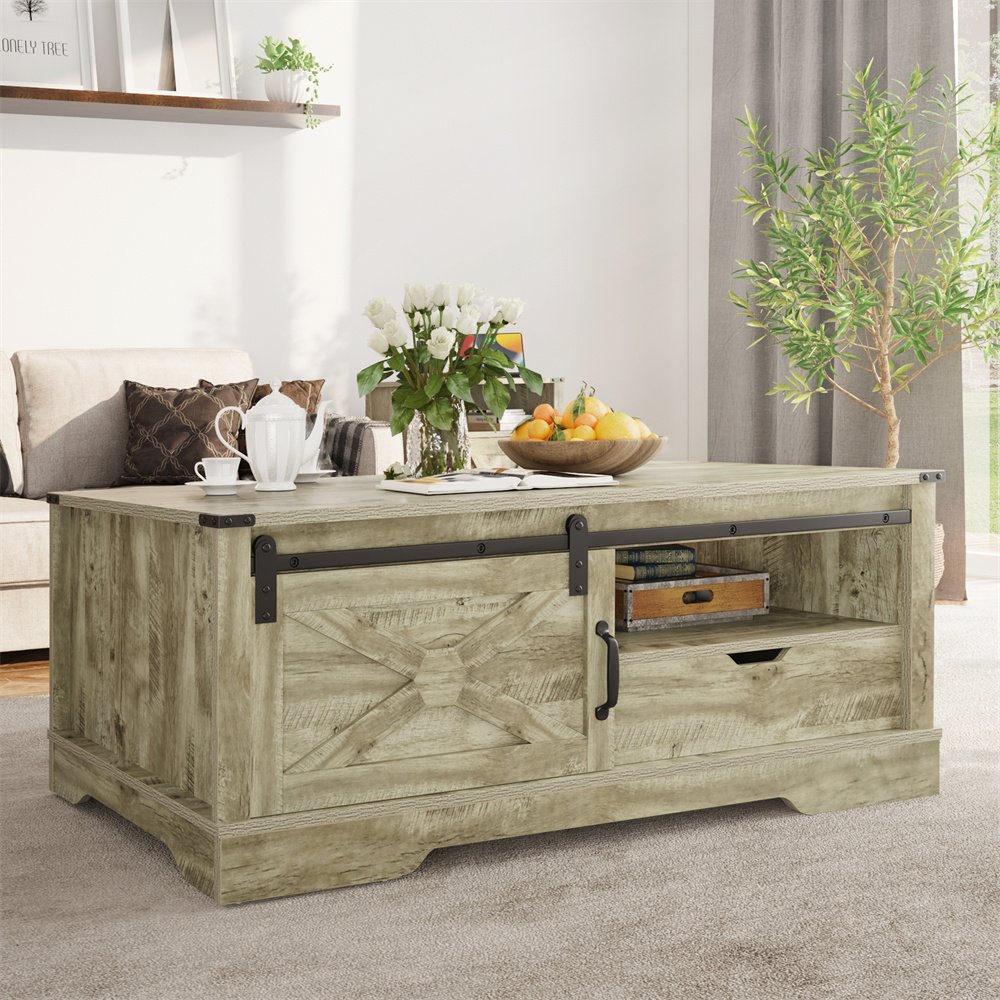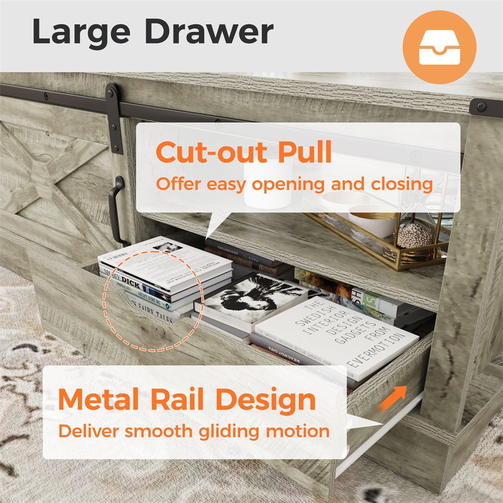 Product Material:Crafted meticulously from robust MDF and engineered wood, this furniture ensures unwavering stability. The generously proportioned tabletop easily accommodates items, supporting weights of up to 160 lbs without compromise.Product Size:Boasting a spacious 48" x 22" tabletop, upper open shelves, a convenient drawer, and a concealed cabinet, this storage coffee table offers versatile organization for magazines, snacks, and remote controls, optimizing space and tidiness.Product Design:Experience easy movement with the sliding barn door of this farmhouse coffee table, effortlessly concealing or showcasing your items. Unlike swing doors, it optimizes space by eliminating the need for swinging motion.